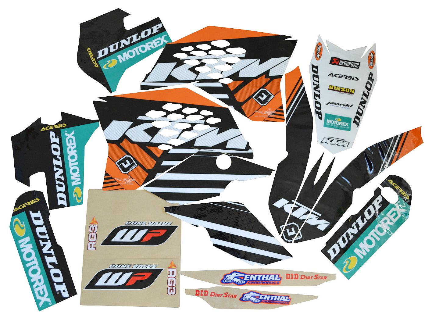• В комплект входят наклейки на : защиту пердней вилки,перднее крыло,передний номерной фон,боковины радиатора,фильтровый коробок,маятник,задние номерные боковины,заднее крыло.