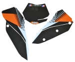 • В комплект входят наклейки на : защиту пердней вилки,перднее крыло,передний номерной фон,боковины радиатора,фильтровый коробок,маятник,задние номерные боковины,заднее крыло.